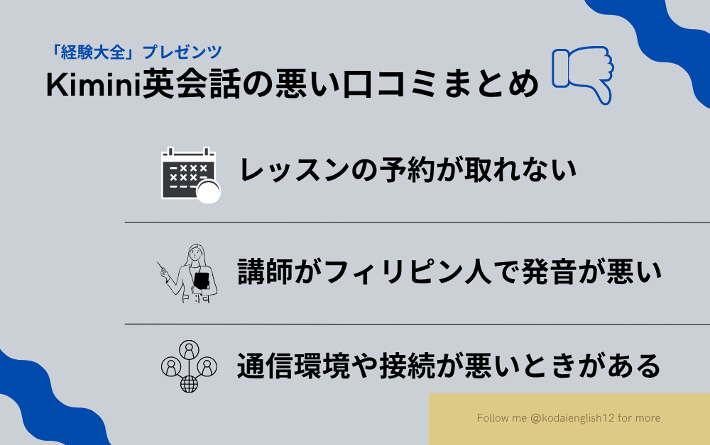 まずは、Kimini英会話に関する悪い口コミを紹介します。SNSやインターネット上の実際の利用者の声を紹介するので、ぜひ参考にしてください。