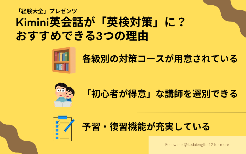 それくらいKimini英会話は英検対策にもおすすめなのですが、その理由は以下の3つです。