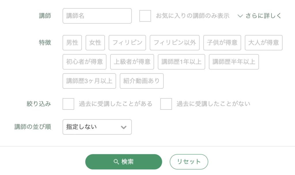 英検対策では、講師との相性も重要です。Kimini英会話は講師の検索機能が豊富で、さまざまなフィルターで講師を選別できます。